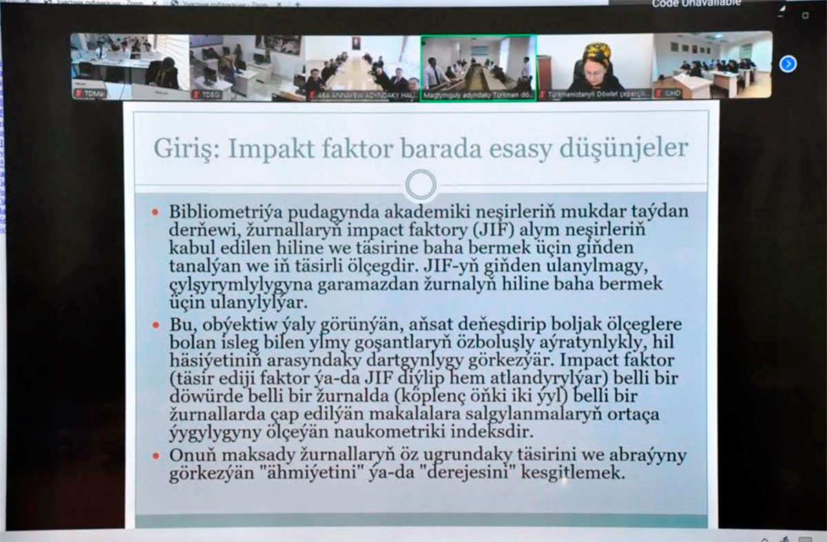 «Halkara indeksirlenýän ylmy žurnallaryň impakt-ýagdaýy (IÝ ýa-da IF)» diýen tema boýunça geçirilen okuw-usulyýet onlaýn okuw maslahaty Türkmenistanyň ýokary okuw mekdepleriniň mugallymlaryny bir ýere jemledi.