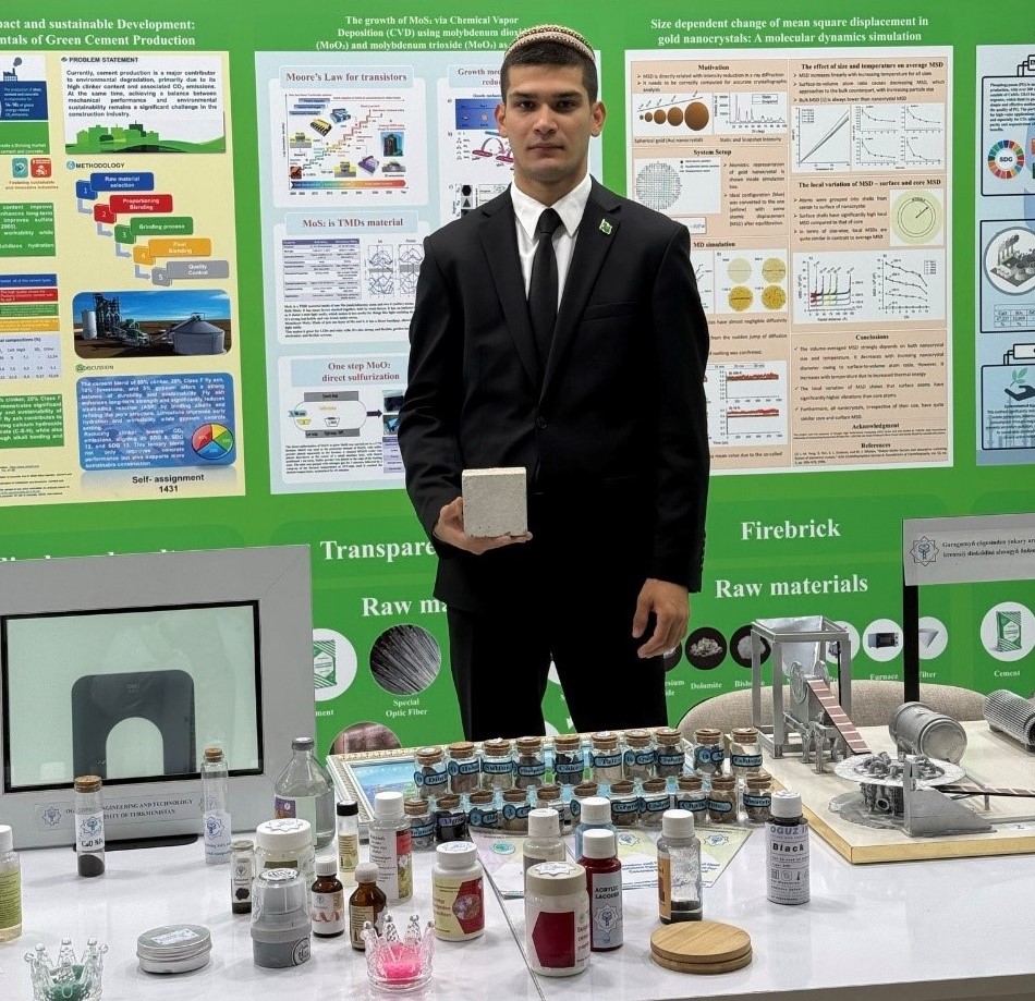 Türkmen uniwersitetiniň himiýa-tehnologiýa fakultetiniň 4-nji ýyl talyby Süleýmanmuhammet Şamuhammedow altyn medala we bäsleşigiň baş baýragy bolan «WSDG Innovation Grand Award» baýragyna mynasyp boldy. Ýaş alym bäsleşikde «Durnukly ösüş üçin ýaşyl sementi öndürmegiň ylmy esaslary» atly ylmy-barlag işi bilen çykyş edip, onda sementiň önümçiliginde daşky gurşawa ýaramaz täsirleri azaltmagyň ylmy esaslarynyň işläp taýýarlamalary bilen tanyşdyrdy. Şunda ýaş alym energiýanyň netijeli ulanylmagyna hem-de giňden ulanylýan bu gurluşyk serişdesini öndürmegiň ekologiýa taýdan arassa usullarynyň ornaşdyrylmagyna aýratyn üns berdi. Süleýmanmuhammediň işi dünýäniň öňdebaryjy ylmy guramalarynyň ýokary bahasyna mynasyp boldy we Durnukly ösüş ulgamynda möhüm çözgüt hökmünde ykrar edildi.